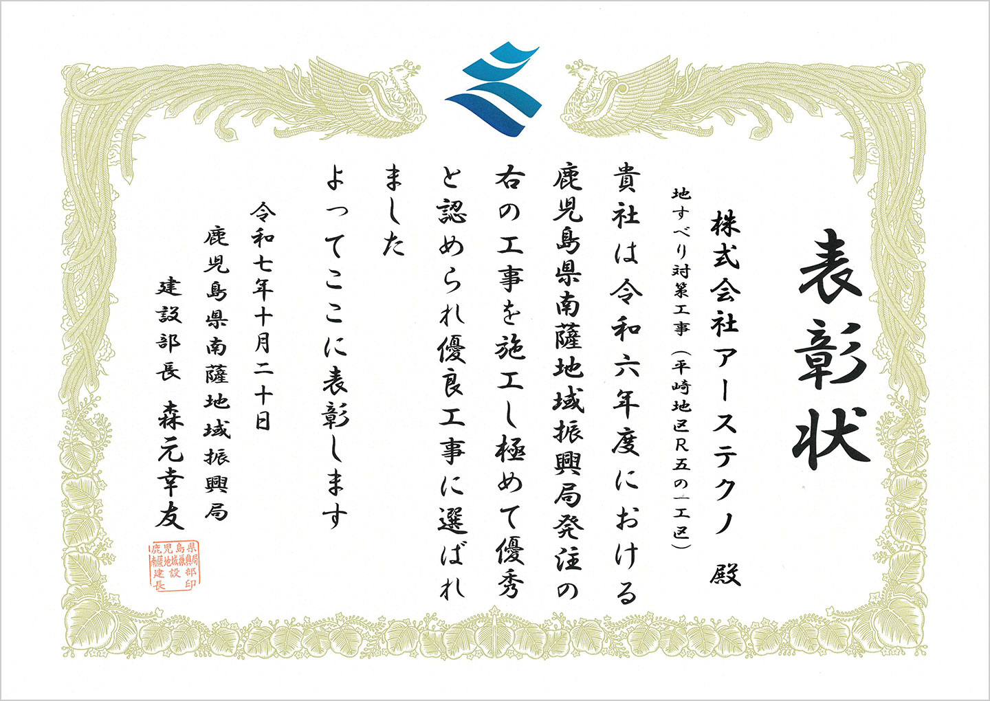 このたび、当社が施工を担当した工事(詳細は以下リンク参照)において、鹿児島県土木部南薩地域振興局建設部長より優良工事表彰を賜りました。